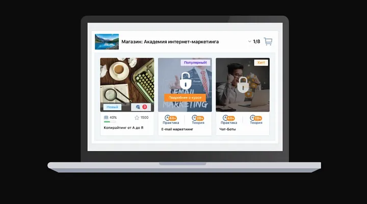 Начнем с того, что магазин предполагает создание онлайн-витрины с вашими курсами, которую ученик видит внутри своего личного кабинета. И каждый курс на этой витрине привлекает внимание, ведь у него яркая обложка, отображается количество теории и практики, плюс висит иконка «Хит продаж» и т.д.