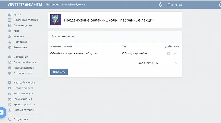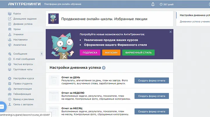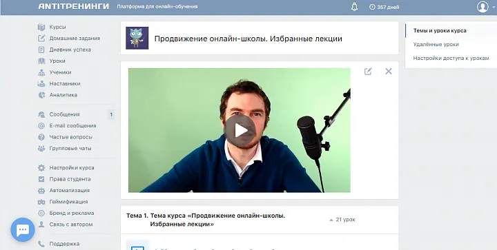 От тарифов и цен перейдем к обзору функций, которые выделяют этот сервис среди других платформ для инфобизнеса. Если отталкиваться от того, что «Антитренинги» ратуют за результативное онлайн-обучение, то самое интересное в этом сервисе – это личный кабинет ученика.