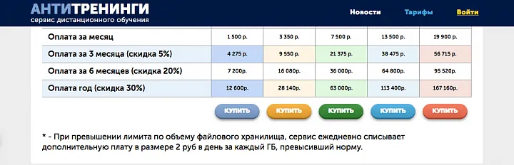 Итак, всего на «Антитренингах» представлено 5 тарифов. Помимо ограничений в функционале, они отличаются по 3 основным параметрам: число пользователей и активных учеников, объем места в хранилище.