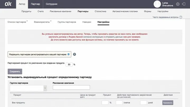 Во вкладке «Партнеры» я нашла инструменты для работы с партнерской программой. И надо отметить, что партнерку можно настроить вручную для каждого партнера или массово для всех.