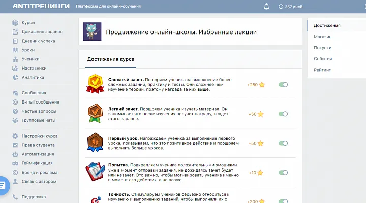 Вводный курс – это очень удобно, ведь можно одновременно посмотреть личный кабинет глазами учеников и корпеть над своим первым курсом. Так, за первые 5 минут внутри кабинета я увидела, как работает система зачетов и поощрений, то есть геймификация обучения.
