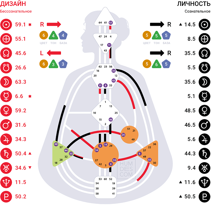 Эти характеристики в системе дизайна человека — зеркало того, как человек себя ведет в жизни и решает самые разные вопросы, ключевые личностные особенности, склонности и предрасположенность к деятельности. У каждого профиля два числа. Первое говорит о личности, или сознательной части психики, a второе — о бессознательном.