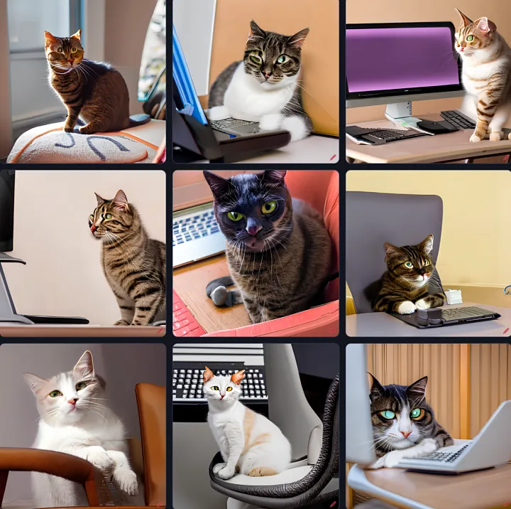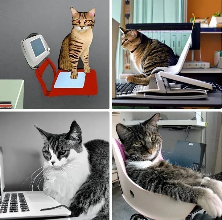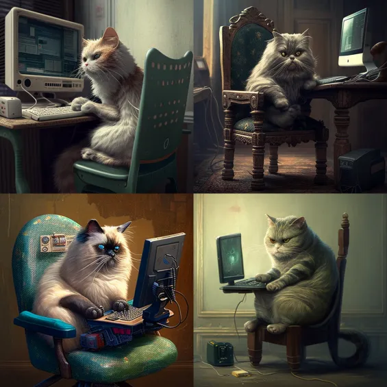 В обзоре рассказали о популярных нейросетях для рисования, протестировали их и попросили сгенерировать одно и то же. Запрос был таким: «the cat sits in a chair, works at a computer» (кот сидит в кресле, работает за компьютером).
