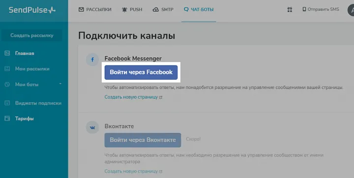 Теперь, давайте создадим чат-бота, который поможет нам собрать обратную связь от участников вебинара и подарить скидку. SendPulse позволяет создать чат-бота в WhatsApp*, Telegram, ВКонтакте, Facebook Messenger*. Для разработки виртуального помощника в верхней строке меню выберите вкладку «Чат-боты», затем «Подключить каналы» и нажмите «Войти через Facebook».