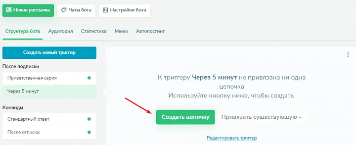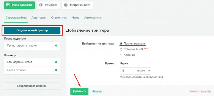 Чтобы он начал коммуникацию с пользователями сразу после подписки, нажмите «Создать новый триггер», затем выберите «После подписки» и кликните «Добавить».