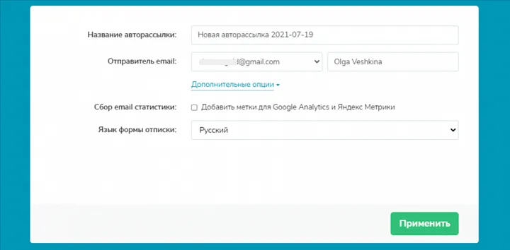 Далее введите название авторассылки, укажите корпоративный email отправителя и имя, выберите язык формы отписки и нажмите «Применить».