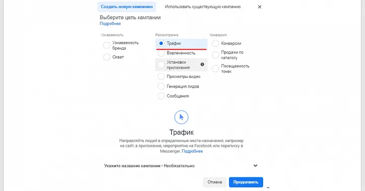 Теперь, когда у вас уже есть лендинг, чат-бот и серия email писем, самое время привлечь в автоворонку потенциальных клиентов. Для этого вам понадобится Facebook Ads Manager. Чтобы создать рекламное объявление в Facebook, выберите цель «Трафик».
