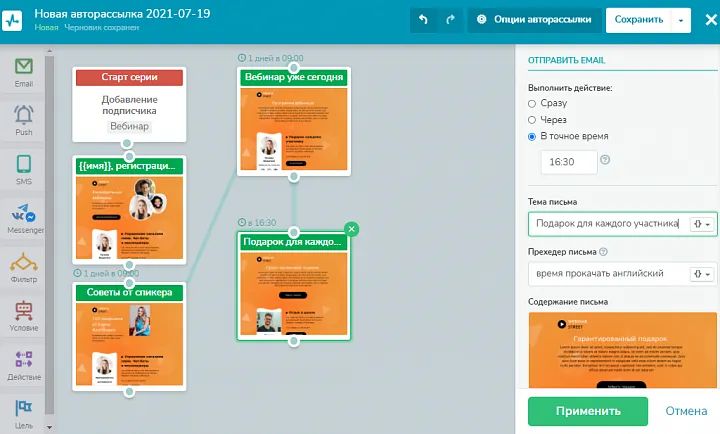 Теперь из меню слева перетащите блок «Email» и присоедините его к блоку «Старт серии». В меню справа задайте время отправки письма «Сразу», далее добавьте тему, прехедер и выберите шаблон — его вы можете отредактировать на свой вкус. Это будет первое письмо из серии, в котором участники вебинара получат подарок за подписку.
