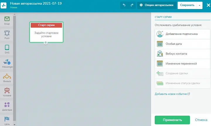 Чтобы подписчики получали письмо сразу после регистрации, необходимо задать стартовое условие. Кликните на блок «Старт серии», в меню настроек справа выберите «Добавление подписчика», укажите созданную вами адресную книгу и нажмите «Применить».