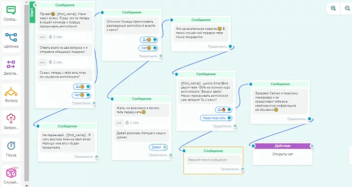 Теперь приступим к созданию цепочки сообщений, которая поможет собрать обратную связь от участников и подарить подарок, — скидку на полный курс по изучению английского.